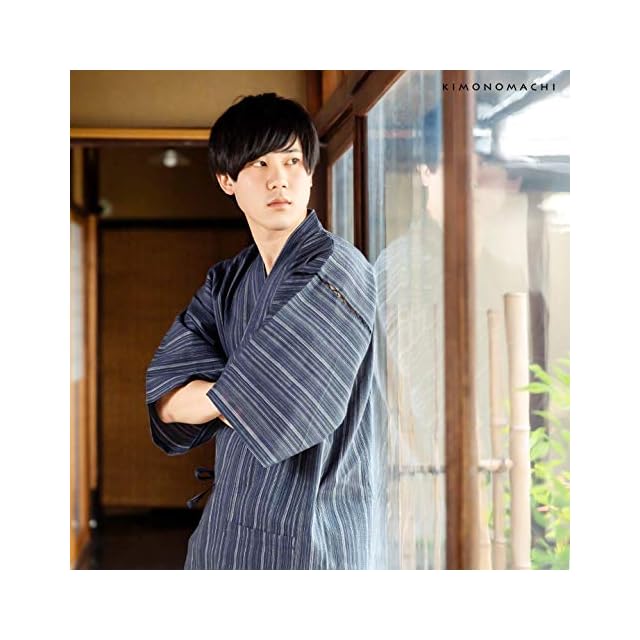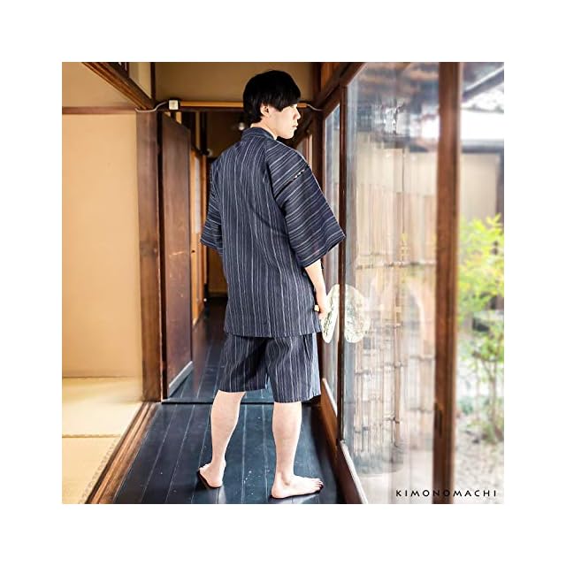 [KIMONOMACHI] [ 京都きもの町 オリジナル メンズ 甚平 紺白縞 綿麻甚平 Lサイズ 父の日 ギフト プレゼント 部屋着 ルームウェア 大きいサイズ