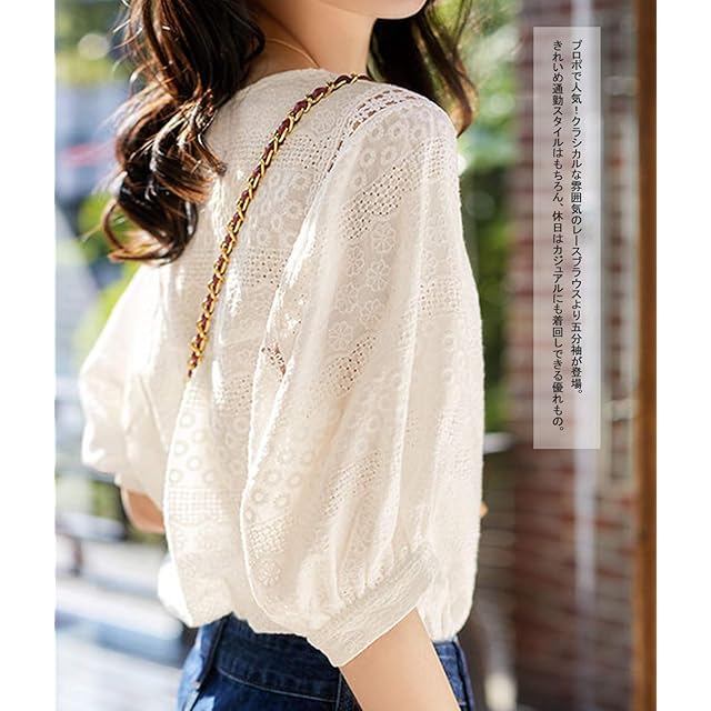 [Yino] (イノ) レース シャツ ブラウス レディース トップス 小花 刺繍 半袖 Uネック 透かし編み 着痩せ 可愛い おしゃれ ボリュームスリーブ 女性らしい カジュアル 通勤 デート お出かけ