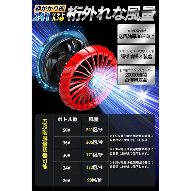 商品名:50V 空調作業服 ファンバッテリーセット超高出力 日本製ブラシレスモーター BURTLE/バートルファンに完全対応 マルチモード 3D曲面導流 高性能 21700型 超高速充電 熱中症対策 暑さ対策 空調作業着用 90mm作業服穴径対応 PSE認証済