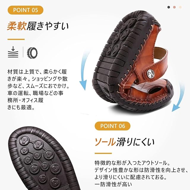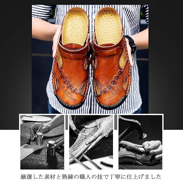 【本革・おしゃれ】精選上層部牛革を使用され、滑らかで柔らかいです。更に光沢感があり、質感がグッとアップしてくれます。本革なので、濡れても大丈夫!耐久性が素晴らしいです。この夏はこの1足のサンダルで十分に快適になります。