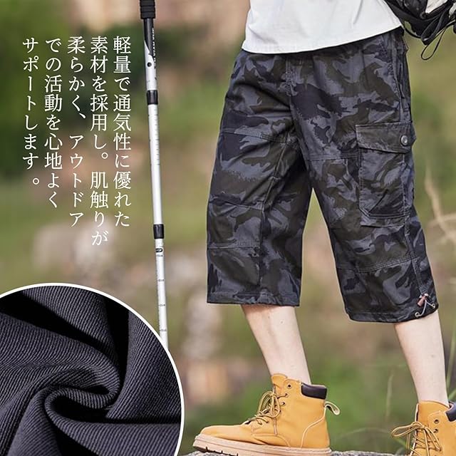 [素材] ワークパンツ メンズ 7分丈 綿素材で作られており、柔らかく快適な着心地を提供します。肌に優しい素材で、日常着として最適です。