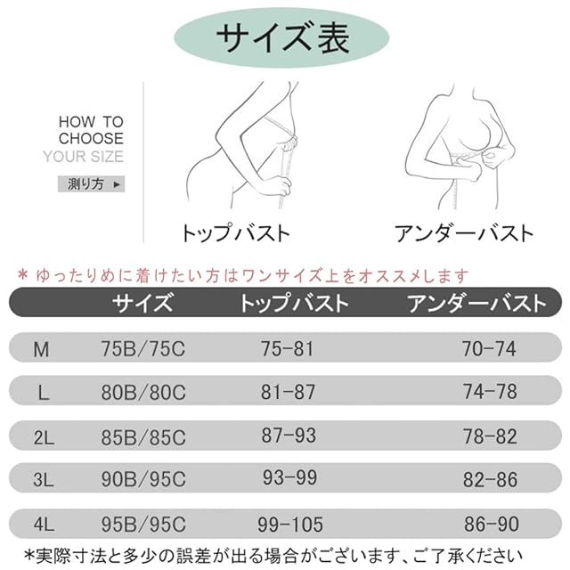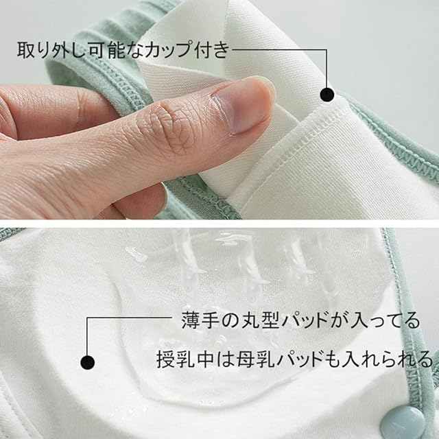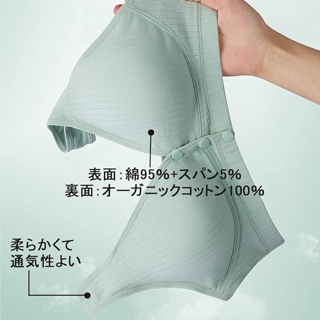 立体構造だから実現できる、抜群のホールド力でバストを優しく包み込みます。授乳後も垂れずに綺麗な上向きバストに。 2.脇高構造だから横になってもバストのお肉が背中に流れず、スッキリ綺麗です。 3.幅広に仕上げたショルダーラインが体を締め付けません。背中にホップがないから、おやすみブラとしても着心地良くご利用いただけます。 4.夜中の授乳時にも外出先でもサッとできます。 5.サイズの変化が激しい産前産後のバストにも対応できるから長く使える 6.ノンワイヤーだから締め付け感がなく優しいつけ心地 7.内側の肌に触れる部分は綿100%、表面は綿95%+スパン5%。 産前産後の敏感なお肌、赤ちゃんのお肌にも優しい。 【妊娠初期(〜4ヶ月)】 ●妊娠初期から胸の張りがあり、つわりも重なり通常の ブラジャーでは息苦しさを感じていました。 産前産後用 ブラジャーでも、ワイヤー入りだと息苦しい感じが していたのでこちらを注文しましたが、軽い着け心地で、 でもきちんと胸にフィットし、とても快適です。 以前、同じシリーズのキャミタイプを授乳期に使用 していて、大活躍でした。 こちらのタイプも産後まで 活躍してくれることを期待しています! ! ●黒だし形もきれいだし、授乳中からその後もちゃんと 使えそうで最高です。 赤ちゃんのお迎え準備には異常に お金がかかるのでありがたいです。 【妊娠中期(5〜7ヶ月)】 ●中期になり ちょっと大きめの方がいいかなと思い、 Lにしました。 今は一番奥のホックで丁度よく、今後 サイズアップしてもホックで調節できるので安心です。 締め付け感は一切ないのに程よくバストをホールドして くれます。 着心地も軽いです。 リピートします。 【後期(8ヶ月〜)】 ●生地も作りもしっかりしていて、柔らかすぎず いいです! このお値段ならもう2つくらい買い足そうかな と思います。 ちなみに、妊娠9カ月の155センチ、51 キロ、Mでちょうどです。 【産後】 ●授乳ブラを買い足したく探していました。 デザインも 何種類もあり、授乳もしやすいので気に入っています。 すごく長く使えるものではないかもしれませんが、 このお値段なら何枚か買ってローテーションすれば、 授乳期は充分だと思います。