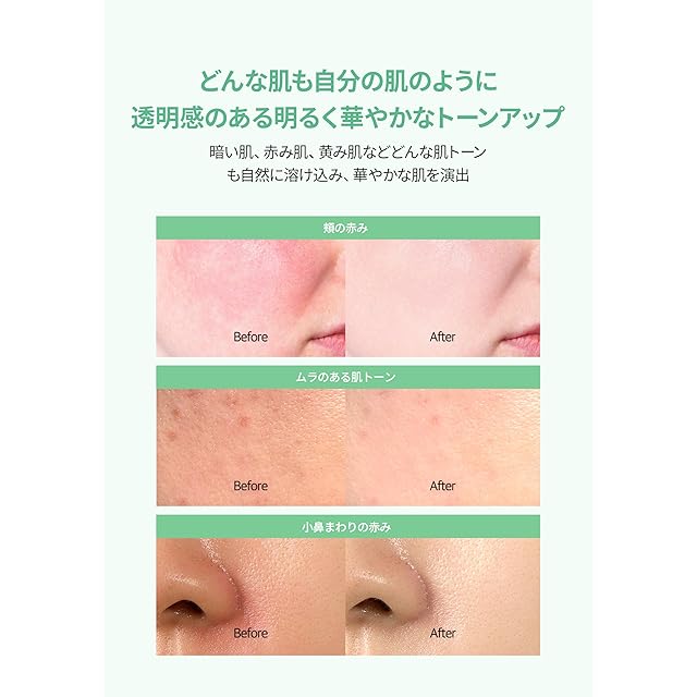 【グリーントーンアップ用(赤み・肌トーン)】頬や小鼻まわりの赤みを自然に補整し、均一で穏やかな印象のトーンに仕上げます。肌なじみの良いグリーンカラーで、ナチュラルに整った印象へ導きます。