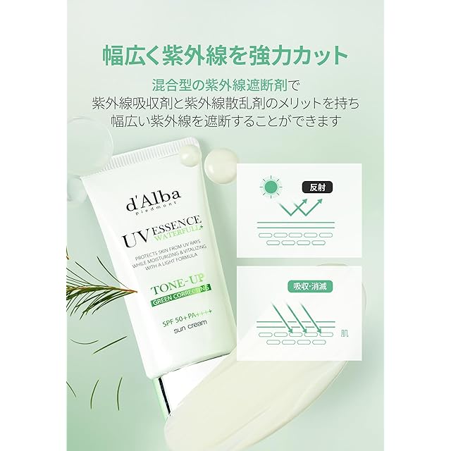 ダルバ(d'Alba) トーンアップ UVエッセンス サンクリーム - SPF50+/PA++++ 化粧下地 日焼け止め 美容液 汗と水に強い ウォータープルーフ イージーウォッシャブル 一度に落とせる ファンデフリー 紫外線 敏感肌 乾燥肌 低刺激 顔 全身用 ヴィーガン (グリーン 50ml)