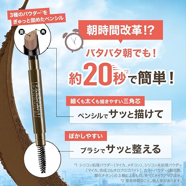 ①3種のパウダー(*2)をぎゅっと固めたペンシル 3種のパウダー(*2)配合でニュアンスカラーもふわっと自然、なのに手早く仕上がる。さらに、三角芯で細くも太くも描きやすい。 *2 シリコン処理パウダー(マイカ、メチコン)、シリコン未処理パウダー(マイカ、合成フルオロフロゴパイト)、カラーパウダー(酸化鉄、酸化チタン)の3種によるもの。すべてメイクアップ成分。
