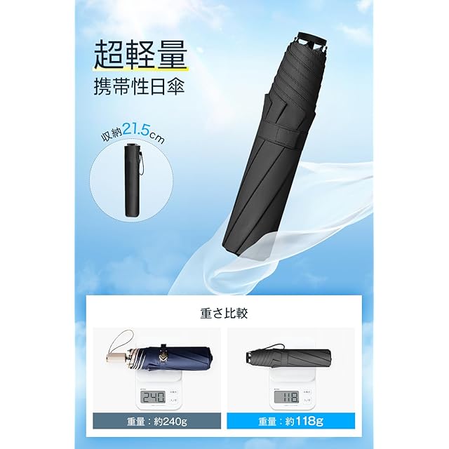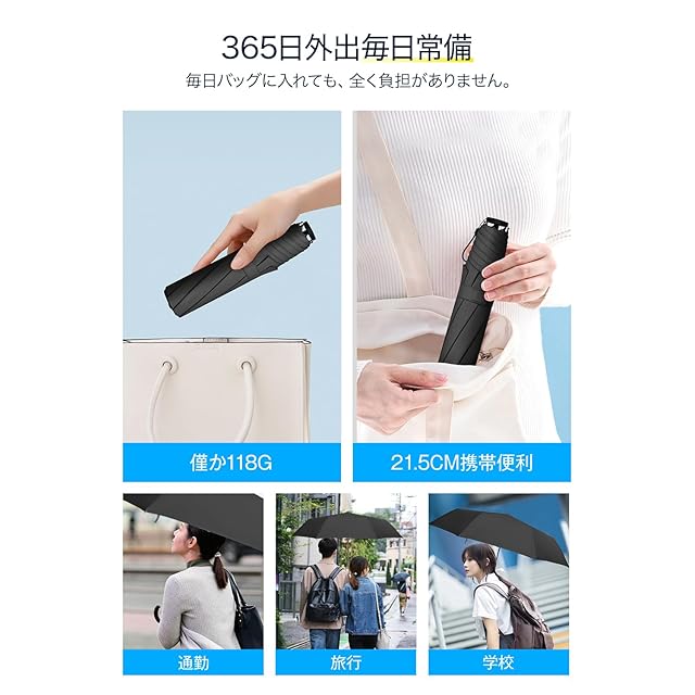 【2025新登場 & 118g軽量 & JIS認証】 日傘 UVカット 100%遮光 遮熱 折り畳み日傘 軽量 コンパクト 折りたたみ傘 兼用雨傘 紫外線遮断 耐風撥水 晴雨兼用 携帯便利 男女兼用 レディース メンズ キッズ 収納ポーチ付き (マットブラック)