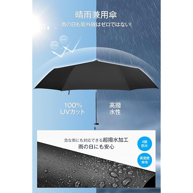 【4層構造 & 日傘兼用雨傘】この日傘は4層構造を採用しています。外側は撥水加工が施され、雨を速やかに弾き、軽量で快適に使用できます。中間層には赤外線吸収と紫外線反射の役割を果たす層があり、UV防護効果が高いです。内部にはブラックゴム複合材料が使われており、一部の紫外線や熱放射を反射し、水や汚れの浸透・付着も防ぎます。そのため手入れも容易です。この構造により、晴れや雨の日において通常の傘よりも高い保護性能を発揮します。