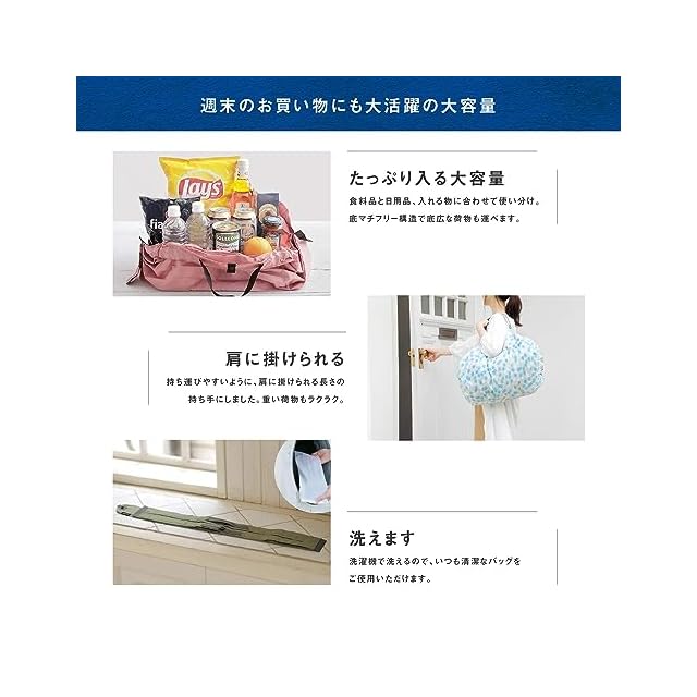 【レジカゴにかけられる大容量サイズ】1週間のまとめ買いにもおすすめのLサイズ。買い物の精算時、レジカゴにセットすれば、荷物を移し変える必要もなく、そのまま持ち帰ることが出来るので時短にも。袋口にボタンがついているので中身がこぼれにくく、持ち手が長く肩がけできて重い荷物もラクラク。