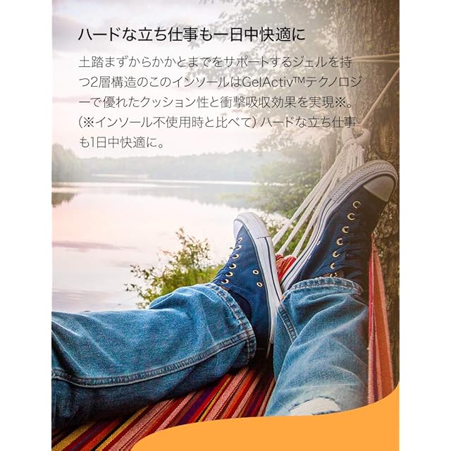 ・1日中* 衝撃吸収 *一日中(16時間)使用後と新品状態での本品のかかと部分を比較して、衝撃吸収性が同等である事を確認。