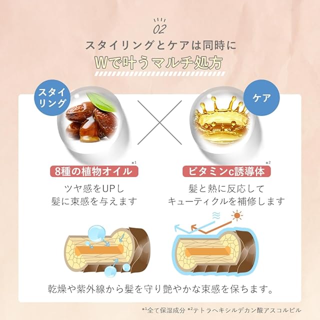 ✨【 スタイリング × ケア 】 ダブルで叶うマルチ処方!乾燥や紫外線から髪を守り、艶やかな束感を保ちます。