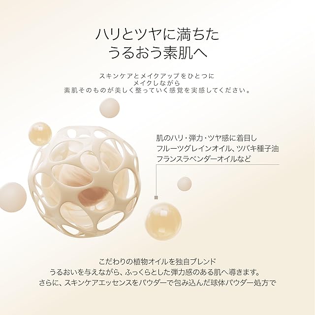 POINT2 スキンケアエッセンスでファンデを包む 生命感あふれるつややかな素肌へ 液体保湿成分をプラスし、まるで素肌のように透明感があふれる スキンケアエッセンスと粉体を十分に混ぜ、焼き上げて何度も圧縮して作られる なめらかで光り輝くしっとりとした肌に仕上げる