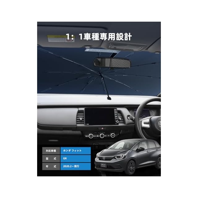 【適合車種】新型 ホンダ フィット GR系 GR1/2/3/4/5/6/7/8型(2020~現行)。本フロントウィンドウ用サンシェードは車種別専用設計となっておりますので、ご購入前にお車の車種をご確認ください。