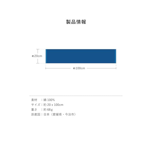 素材:綿100% / サイズ:約20×100cm / 重さ:約68g / 原産国:日本(愛媛県・今治市)/ 今治認定番号:2023-1126