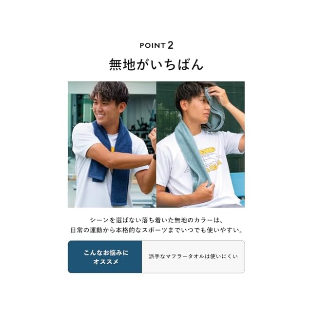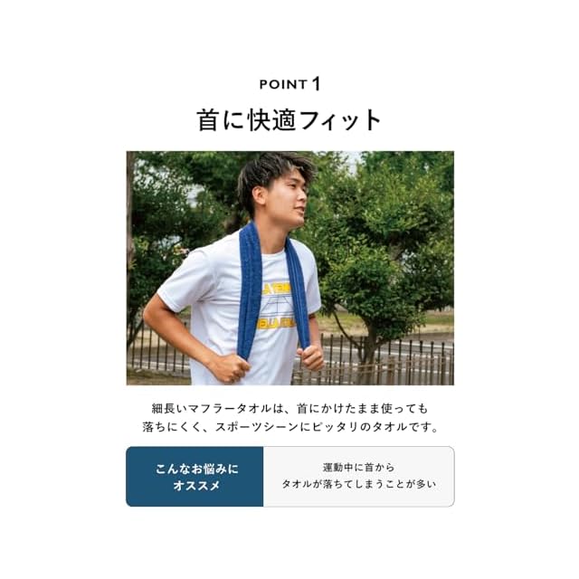 【首に快適フィット】細長いマフラータオルは、首にかけたまま使っても落ちにくく、スポーツシーンにピッタリのタオルです。