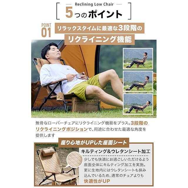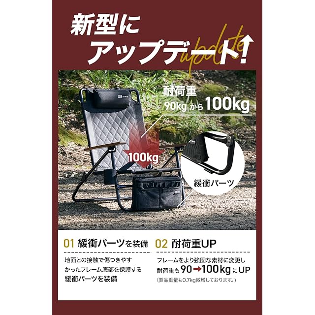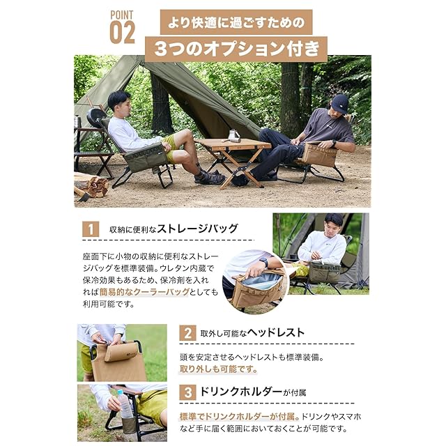 【その他のスペック】・ドリンクホルダーが付属:ドリンクやスマホなど、手に届く範囲においておくことが可能です。・取り外し可能なヘッドレスト。頭を安定させるヘッドレストも標準装備。取り外しが可能です。・ウェビングループ付き:・かんたん設営:使用時は開くだけで設置できるかんたん設計です。