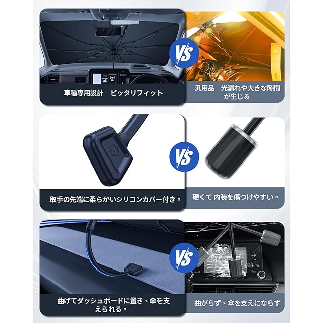 【干渉ゼロ。傷ゼロ。設置がスマートに進化】「車用傘型サンシェード=内装を傷つけるもの?そんな常識を覆す」TPE素材の傘柄が柔らかくしなり、自由自在にフィット。フロントガラスに当たらず、運転席を圧迫しない。さらに、ハンドルにはシリコンカバー付きで、センターコンソールとの擦れ・摩耗をシャットアウト。毎日開けても、閉じても、キズ一つ残さない。このやさしさ、クセになる。