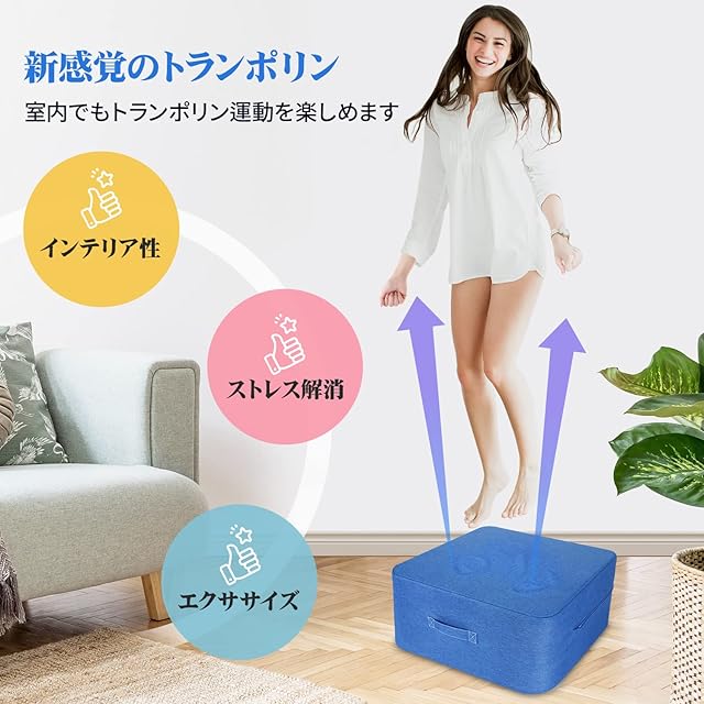【人気アイテム:室内用トランポリン】日本開発チームに開発された最新型トランポリンです。高反発素材を採用し、おうち時間でも気軽にジャンプエクササイズが楽しめます。お部屋になじむインテリア性を備え、使わない時はクッションとしてもご利用いただけます。ストレス解消、エクササイズにぴったり、絶対に見逃したくない人気アイテム。