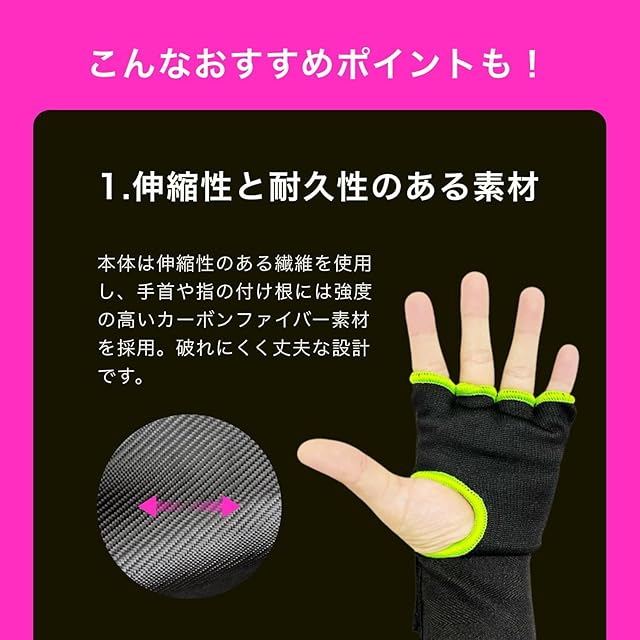 ✅【 伸縮性&耐久性のある素材 】本体部分には伸縮性のある繊維を採用し、強度を必要とする指の付け根と手首部分にはカーボンファイバー素材を使用。破れにくい丈夫さを実現しました。