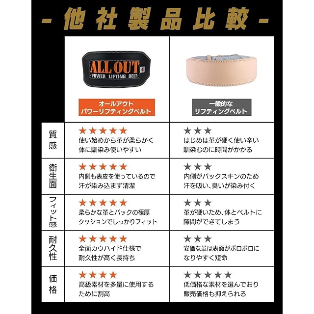 【従来のレザーベルトの欠点を克服 】従来のレザーベルトでは実現出来なかったホールド力を実現。従来のレザーベルトは使い始めの革の固さが欠点でしたが、ALLOUTリフティングベルトは最高級の牛革Cowhideを使用することで見事にその欠点を克服。強力なホールド力がトレーニングレベルを向上させます。背面には極厚クッションを内蔵している為、きつく締めても背中が痛くなることはありません