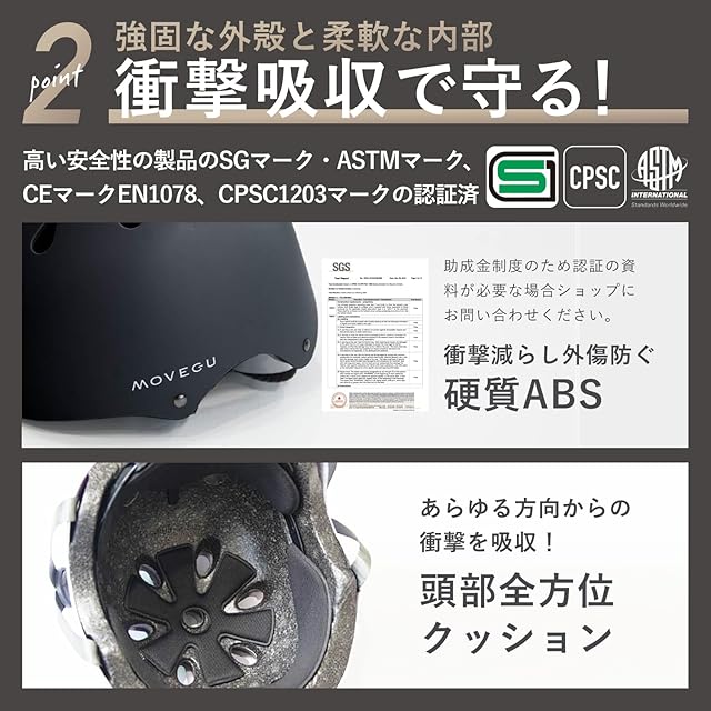 【 優れた材質で安全性を追求 】外殻には 剛性・硬度 ・加工性・耐衝撃性などの特性に優れたABSを使用し、外部からの衝撃を効果的に吸収します。内殻には高密度EPSを採用し、 軽量かつ耐水性に優れた設計で、転倒時に頭部をしっかりと保護します。