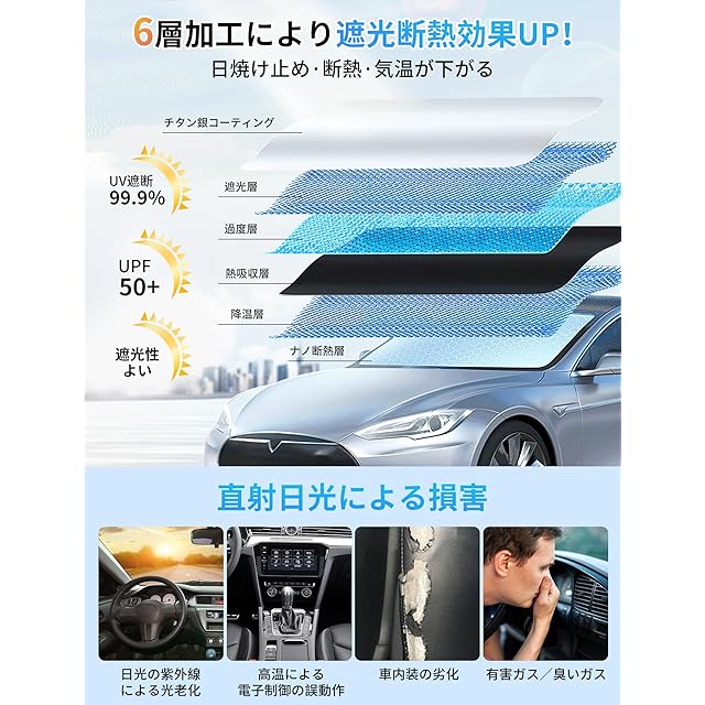 【99.9%以上UVカット・内装劣化防止】車用サンシェードはチタンシルバーコーティングを施した生地を採用しており、紫外線を99%カットし、太陽光によるダッシュボードやシートなどの内装劣化を防ぎます。同時に、サンシェードの使用は省エネです。露天駐車、車に戻る時、急速に冷やすために高消費電力のエアコンを強くする必要がなくなり、車両のエネルギー消費が低減され、環境にも経済にも優しい賢明な選択です。