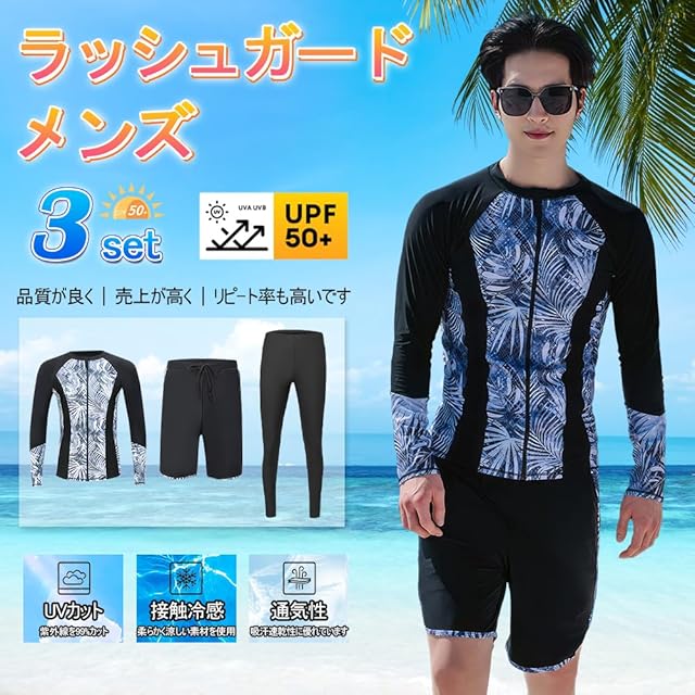 【セット内容】長袖ラッシュガード、ハーフパンツ、レギンスの3点セット。必要なものがセットになっているので、届いてすぐに海に行くことができます。サーフパンツとレギンスセット、レギンス付き足首まであるので、虫刺されやクラゲ対策、擦り傷などの外傷対策にも。