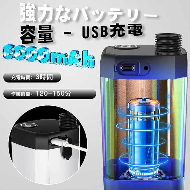 【USB充電式-6000mAhバッテリー容量】ポータブルシャワーは6000mAh大容量バッテリーを内蔵しており、フル充電状態で120-150分間連続使用できます。Type-Cポート付き電動シャワーは携帯電話充電器(5V-2A)、携帯電話電源、ノートパソコンや車のUSB出力で充電でき、いつでもどこでも充電できて便利です。コードレスUSB充電システムの設計により、簡易シャワーは場所を取らず、再利用可能で、環境に優しく、省エネです。(ポンプには水を加熱する機能がありません)