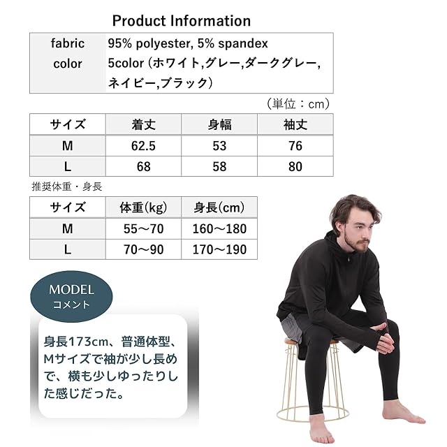 【接触冷感・速乾】通気性が良くなるようにメッシュのような網目になっており、中の蒸れを外に逃がす透湿素材の高機能ラッシュパーカーです。袖は指穴付き(サムホール)になったデザインで、手の甲までしっかり覆えます。また、少し大きめにゆったりした作りになっているので、体型カバーにもなります。