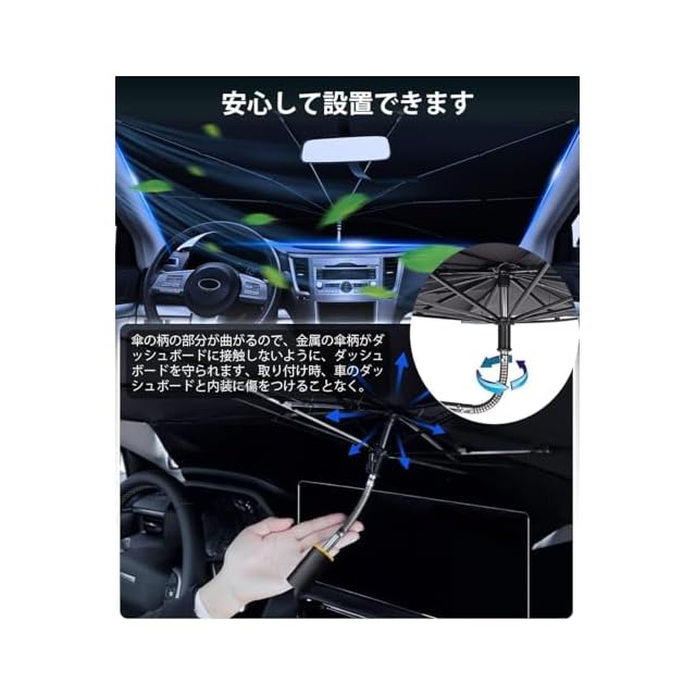 【2025年モデル 新型】ユニークなデザインが採用されます。曲がる可能な傘柄、ダッシュボードの高低により、傘柄を折り曲げて調整できます。金属の傘柄がダッシュボードに触れないように、その摩擦からダッシュボードが守られます。取り付け時、車のダッシュボードと内装に傷をつけることなく、安心して設置できます。1人でも簡単にできます。閉じると収納バッグに入れて、持ち運びやすくてドライブの邪魔になりません。ドアのサイドポケットやグローブボックスなどの中にも収納できるので、車内空間が狭い車にもおすすめです。