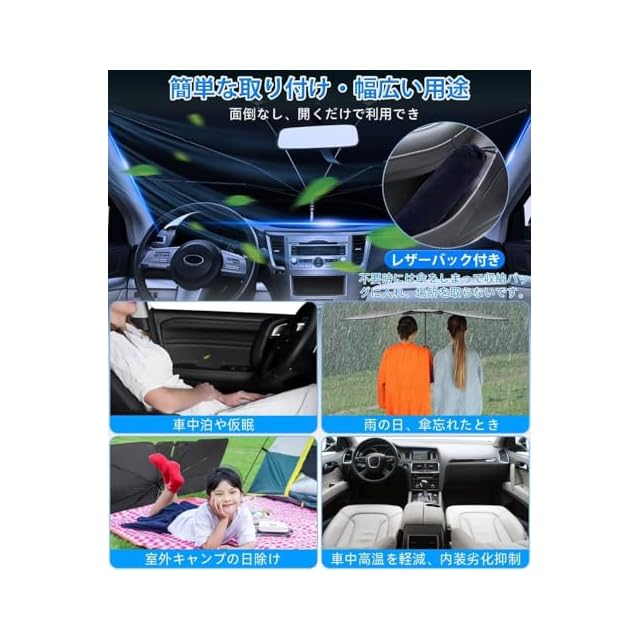 【耐久性が優れる&涼し】この 車 サンシェード は効率的な複合チタン銀接着剤を採用し、傘面:ナイロン、複合チタン銀接着剤、車内の温度を効果的に下げ、ダメージや経年劣化を防ぎます;傘骨:アルミニウム合金、鋼骨製;傘の柄:ABSプラスチック。 サンシェード は熱を遮断して太陽光を反射し、99.5%の紫外線を効果的に遮断し、内装劣化防止。車内の温度を軽減し、エアコンへの負荷がへり、省燃費が向上します。駐車の度に気持ちをより涼しくしてくれます。