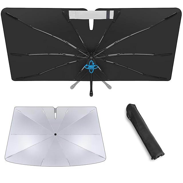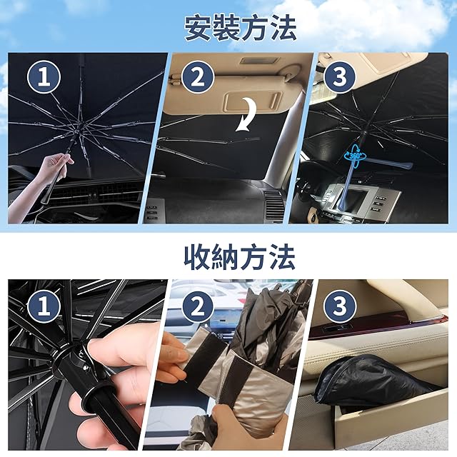 【曲げ可能な傘柄・10本骨ガラス繊維】2024年新登場の傘型 車用サンシェードはユニークなデザインを採用し、傘柄は曲げ可能で、必要に応じて360°調整できます。従来品のステンレス鋼の傘ハンドルより、ダッシュボードなどの内装を傷からスッキリ守ります。さらに中棒は10本頑丈なアップグレードされたガラス繊維を採用し、柔軟性と強度を併せの上、防食加工のため超強靭で錆びにくいし、耐久性も向上させた傘型サンシェード。