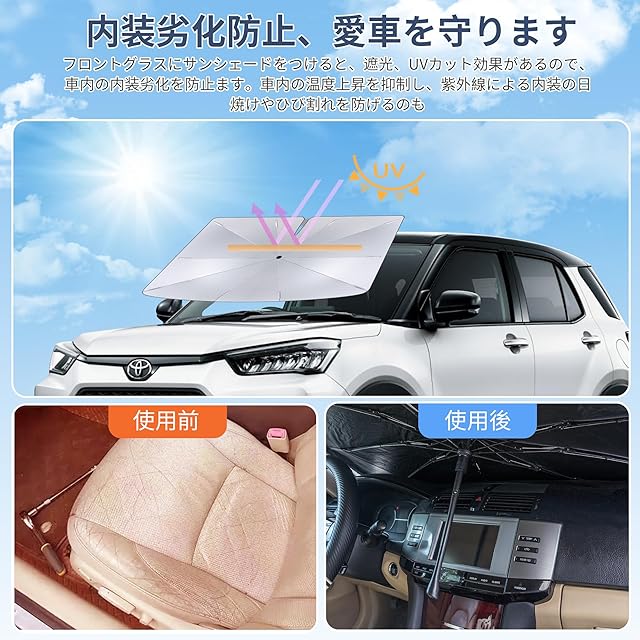 【紫外線防止・遮熱・内装劣化防止】 日中は室外で駐車する場合、猛烈な紫外線が車内に直射して、車内温度が上昇し続けて、愛車のダッシュボード、ハンドル部等ダメージを受けます。フロントグラスにサンシェードをつけると、遮光、UVカット効果があるので、車内の内装劣化を防止ます。車内の温度上昇を抑制し、紫外線による内装の日焼けやひび割れを防げるのも。車中泊や休憩時など、外からの視線が気になるときにも役立ち、プライバシーも保護できます。