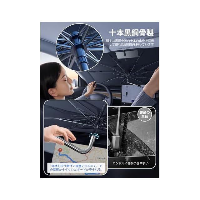 【新しい材質&炭素繊維傘骨】車 サンシェードは今年10 本の傘骨を炭素繊維材質に変更しました。以前のものに比べて、炭素繊維材質はもっと軽いです。開閉や取り付けが簡単です。卓越した強度と靭性を持ち、折れや変形しにくく、車 サンシェードの寿命を大きく延ばします。また、10 本の傘骨の先端にはすべて保護カバーが設けられています。日除け傘の取り付けや使用時に、保護カバーが傘骨の先端が車窓のフィルムを突き抜けたり、車体の塗装を傷つけるのを防ぎます。使用時のあらゆる細部にまで配慮し、愛車に全方位で抜けのない細やかな保護を提供します。安心してご使用いただけます。