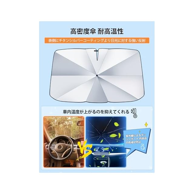 【紫外線の遮断率は 99%】車サンシェード傘面にはチタンシルバーの反射コーティングを精密に施し、高分子断熱材と組み合わせています。これにより、太陽光の 90% を効果的に反射し、紫外線の遮断率は 99% にも達します。駐車時には、車内の温度をも 15℃低下させることができ、涼しい車内空間を提供するだけでなく、ダッシュボードやシートなどの車内装飾部品が日光による劣化を受けるのを効果的に防ぎ、愛車の内装を大切に守ります。