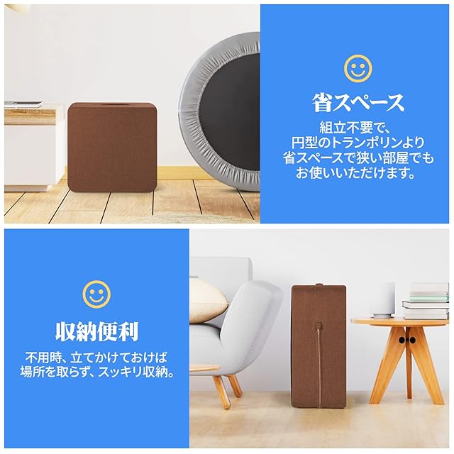 【収納しやすい・省スペース】組み立て不要、円型トランポリンより省スペースで、狭いお部屋でもご利用いただけます。持ち手つきで持ち運びが楽々。耐荷重:約200kg。
