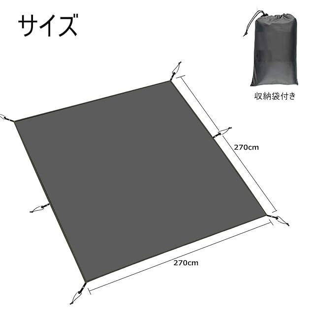 【仕様】材質:210Dポリエステルオックス;耐水圧:3000mm;グランドシート以外にもレジャー用のシートとしても、緊急タープ(天幕)、設営や撤収時の荷物置き場、様々なシーンで大活躍なアイテムです。商品と表記サイズの間に多少の誤差 (2~4cm程度) が生じる場合がございます。予めに了承ください。