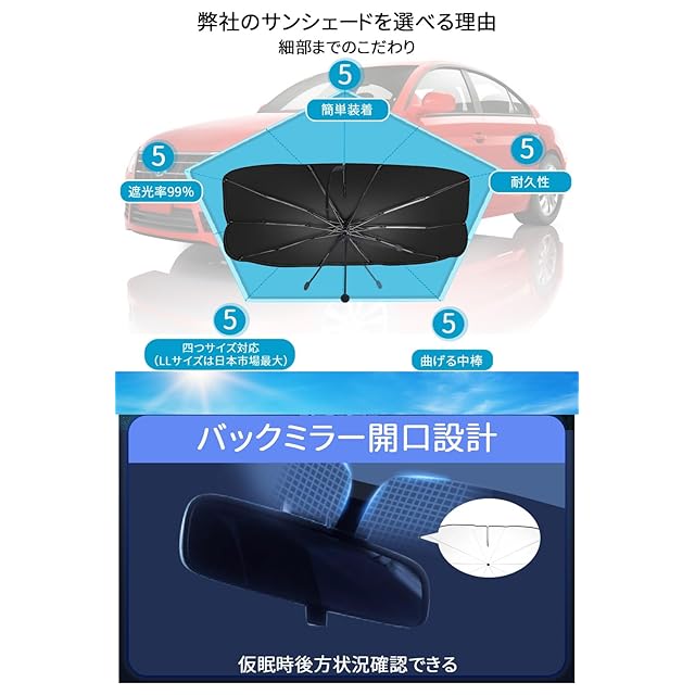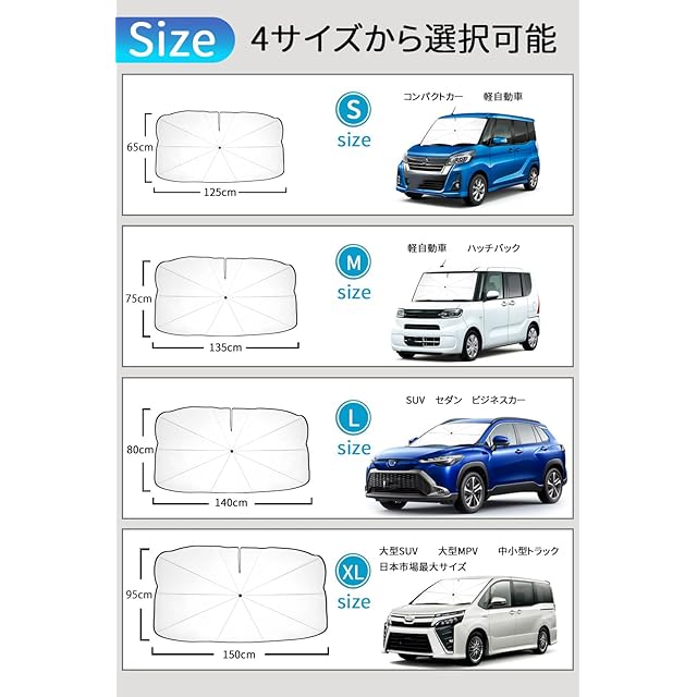 【多サイズオプション・多様な車に対応可能】車用サンシェードはS、M、L、LLの4サイズから選択可能です。また、車 サンシェード 傘骨の尾端が最大5cmまで曲がるため、幅広い車種のフロントガラスに対応できます。車用サンシェード、Sサイズ(125×65cm)、Mサイズ(135×75cm)、Lサイズ(140×80cm)、LLサイズ(150×95cm)の4サイズがあり、99%の車のフロントガラスに適合します。サンシェード 車 フロントは軽自動車、ビジネス車、SUV、MPVなどさまざまな車種で使用可能です。