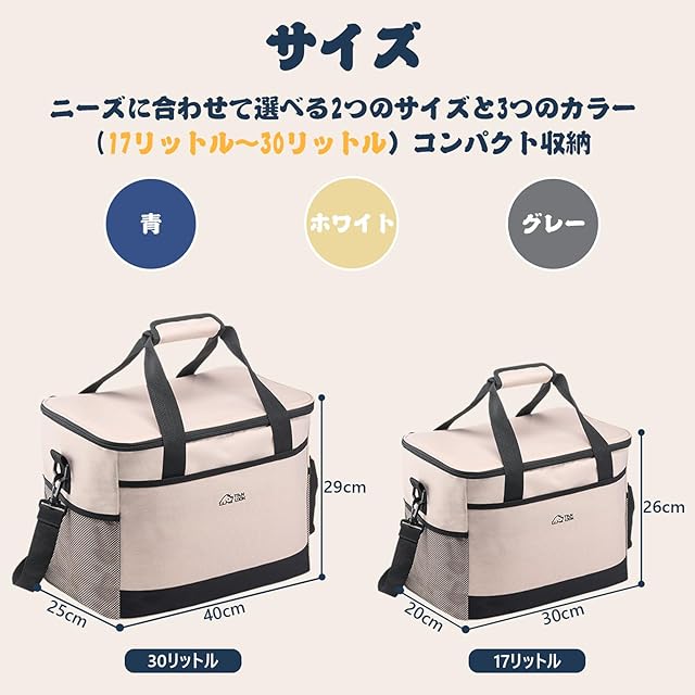 【保冷バッグ サイズ 】容量: 17L、(約): 30 x 20 x 26 cm;容量: 30L、(約): 40*25*29cm;