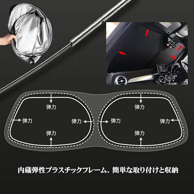 【取り付け方法】①本製品を黒い面が車内側になるように広げ、ダッシュボードの前側に入れてください。②Uカット部をルームミラーに通し、面ファスナーで止めてください。③ガラスに沿って広げ、純正サンバイザーで押さえてください。