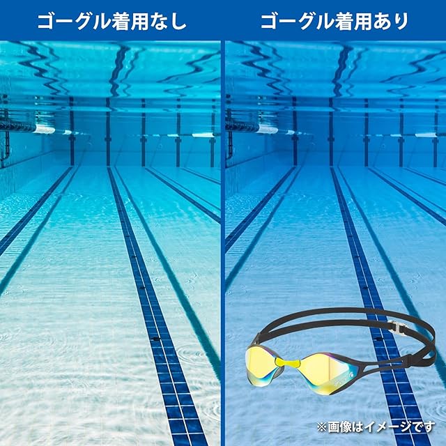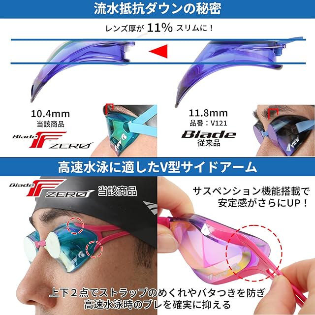高速水泳時にもストラップのバタつきやめくれを防ぎます、レンズ上部の厚みをカットし、飛び込み時の衝撃を緩和