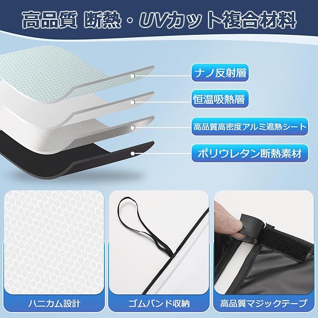 2.【ハニカム設計&高品質多層構造】:表面はハニカム設計で美的感覚とデザイン性が備えているだけでなく、見た目や質感もこだわり。生地は4層断熱、断熱保護を提供し、遮光効果が向上し、耐用年数を延ばす。1層目:ナノ反射層 、2層目:恒温吸熱層、 3層目:高品質高密度アルミ遮熱シート、4層目:ポリウレタン断熱素材。従来品よりも高い断熱効果あり、車内の温度上昇を抑制し、エアコンの効率を高めて省エネになる。