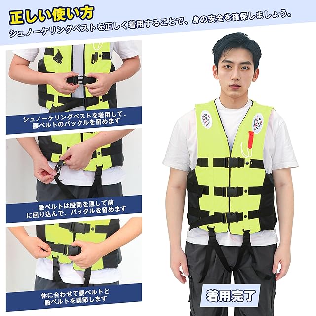 【調節可能なベルトデザイン】腰ベルト3本と股ベルト2本が付いております。腰ベルトはユーザーの体型に合わせて調整でき、フィット感と快適さを向上させます。股ベルトはシュノーケリングベストをしっかりと固定し、水中に抜け落ちることを防止します。
