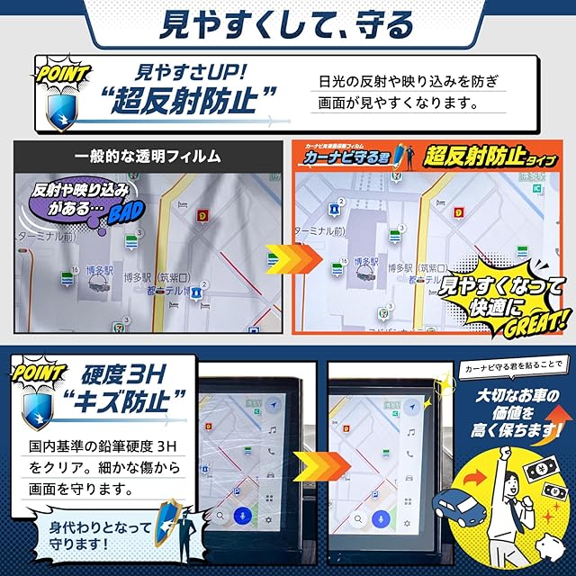 【超反射防止加工】:弊社で研究を重ねた"超"反射防止加工により、太陽光の反射や映り込みを大幅に抑えることで画面が見やすくします。※クリアな画面を求める方には向きません。 【指紋防止】:フィルム表面の特殊フッ素加工により、指紋が目立ちにくく、付着しても簡単に拭き取れます。