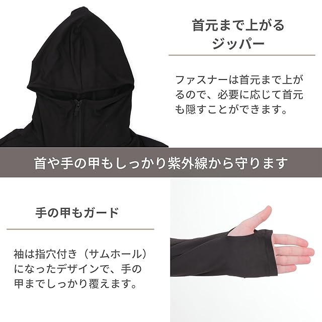 【接触冷感・速乾】通気性が良くなるようにメッシュのような網目になっており、中の蒸れを外に逃がす透湿素材の高機能ラッシュパーカーです。袖は指穴付き(サムホール)になったデザインで、手の甲までしっかり覆えます。また、少し大きめにゆったりした作りになっているので、体型カバーにもなります。