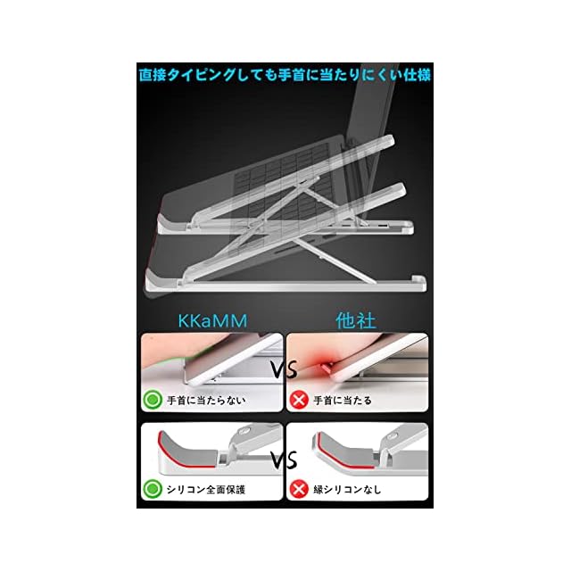 ✅【世界初磁石内蔵&手首が当たりにくい】👍 KKaMM(カム) パソコン スタンドは世界初の磁石内蔵ノートpc スタンドです。よりスムーズに収納ができ、隙間なくよりコンパクトに収納できるpc スタンドです。他社のノートパソコン スタンドはホールダー先端の角度が高くかつシリコンは全面を覆っていないため、タイピングの際はストッパーの先端は手首に当たり痛いのですが、KKaMM ノート パソコンスタンドはストッパーの先端の角度と高さを最適化し、シリコンを縁まで覆っているため、手首の痛みを改善し、直接タイピングをしても快適に使用することができます。