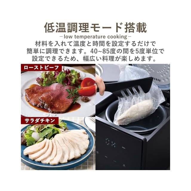 【おかずを調理できる「低温調理」モード搭載】低温調理モードでは、ごちそうメニューのローストビーフやダイエットメニューのサラダチキンなどを、材料を入れて温度と時間を設定するだけで簡単に調理できます。摂氏40度から85度の間を5度単位で設定でき、幅広い料理が楽しめます。