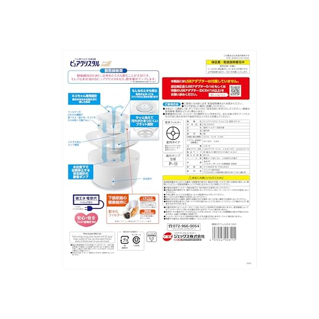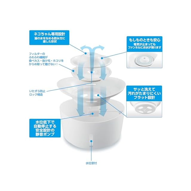 ■ネコちゃん専用設計:猫の水をなめる飲み方に適したファンネル形状 ■もしものときも安心:電気が止まってもファンネルにお水が残ります。 ■サッと洗えて汚れがたまりにくいフラット設計 ■水位低下で自動停止する安全設計の静音ポンプ ■タンク内の水量が分かりやすい水位窓付き