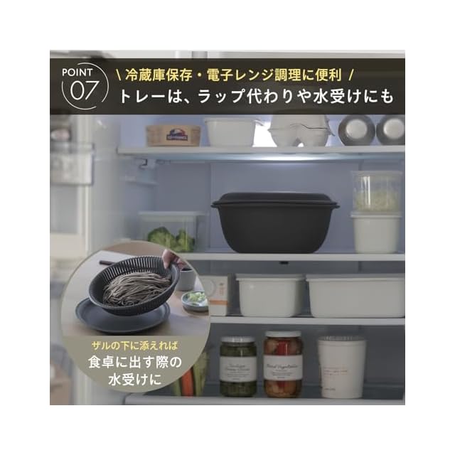 【ボウルに重ねると自然とすき間ができるトレー】トレーは、冷蔵庫保存・電子レンジ調理する際のラップ代わりに。トレー・ザルのフチはウェーブ形状。ボウルに重ねると自然とすき間ができて、蒸気口になります。ザルの下に添えれば、麺類やフルーツを食卓に出す際の水受けにもなります。凹凸をできる限り少なくしたシンプルなかたち。