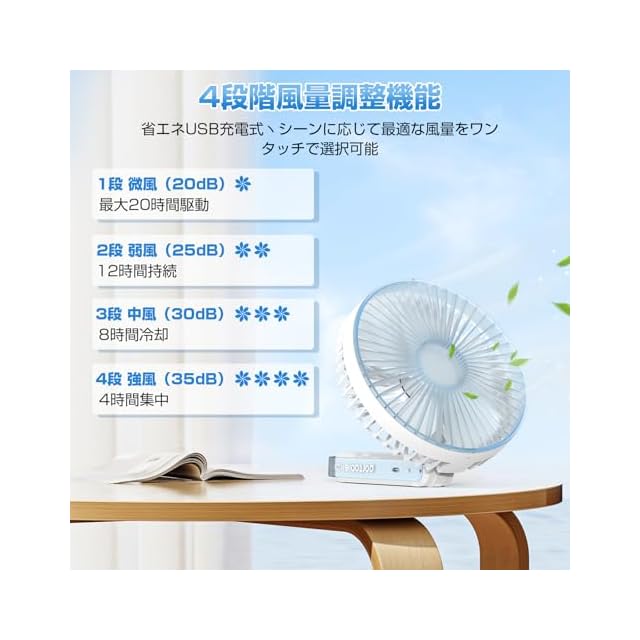 【25dB図書館級静音 × 4段階強冷丨睡眠/户外シーン両立丨深夜も屋外も一台で解決】 1-2段階モードでは25dB未満の静音設計を実現し、赤ちゃんの寝室やオフィスでの集中作業に最適な環境を提供します。 4段階の強風モードでは体感温度を5℃下げ、アウトドア活動時やキッチンなどの高温環境下での熱中症リスク軽減に対応できます。 さらに風量に連動した省エネ機能を搭載し、弱風時には自動で電力消費を70%削減するスマートモードを採用しています。