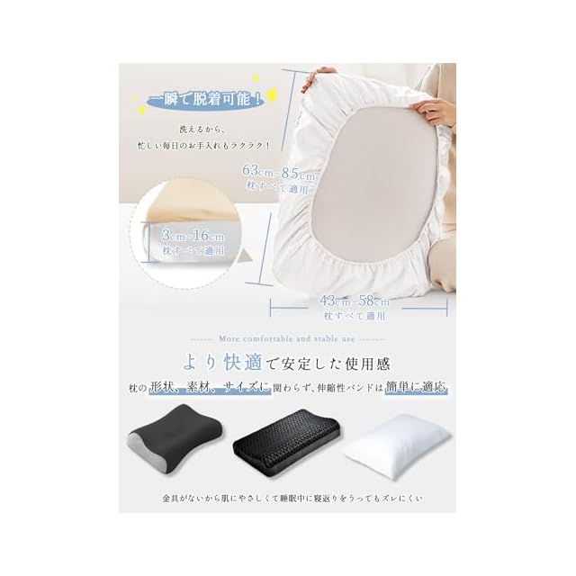 【独自の伸縮性バンドデザイン】独自の伸縮性バンド設計により、枕カバーは枕にしっかりと固定され、寝返りを打ってもズレにくくなっています。枕の形状や素材に関わらず、伸縮性バンドは脱着簡単、チャックなどの金具がなくてより快適で安定した使用感を提供します。